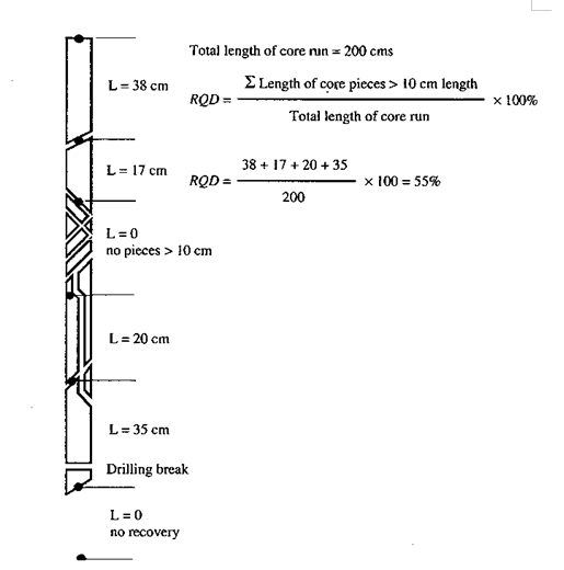 RQD는 암체에 대한 완전한 서술 측면에서는 다소 부족한 점이 있으나, 암반 분류를 위한 인자로서 사용된다. 더욱이 터널 지보(support)요건 추정에의 적용성에서는 가장 큰 장점을 갖는 것으로 보고되어 간단하고, 경제적인 암석 코어의 질(quality)의 산정방법으로서 널리 이용된다(Deere, 1964)<그림 1.14 참조>.