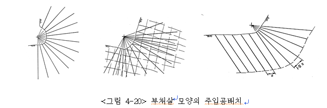 <그림 4-20(2)>는 두 개의 찬공방향이 절리와 평행하며 이를 보완하기 위해 여러공을 추가하여 밀집시켰다. 위와 같은 특별한 경우 이외에는 부채살 공배치 간격을 인근의 정상적인 공배치와 조화롭게 계획하여야 한다<그림 4-20(3)>.