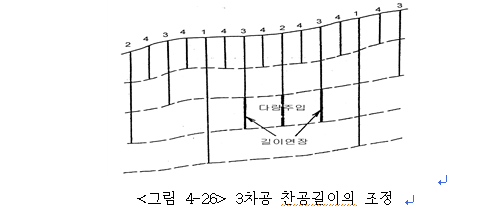 중간내삽법을 단계별 그라우팅에 적용하는 경우를 예를 들어보면 <그림 4-21>과 같이 3단계로 계획된 하향식 그라우팅에서 인접한 1차공을 2단계까지 주입을 완료한 후에 그 사이에 있는 2차공의 1단계 찬공을 시작토록 한다. 그 다음에 1차공을 3단계까지 주입완료한 후 2차공의 2단계를 찬공하며 3차공의 최정부 단계를 찬공한다. 이와 같은 방법을 적용하면 공사의 진행도 빨라지며 앞 단계에서 확인된 투수성과 주입개량정도를 파악할 수 있으므로 나중에 착수하는 공의 찬공심도를 줄이거나 공수를 생략할 수 있어 공사비를 절감할 수 있다.