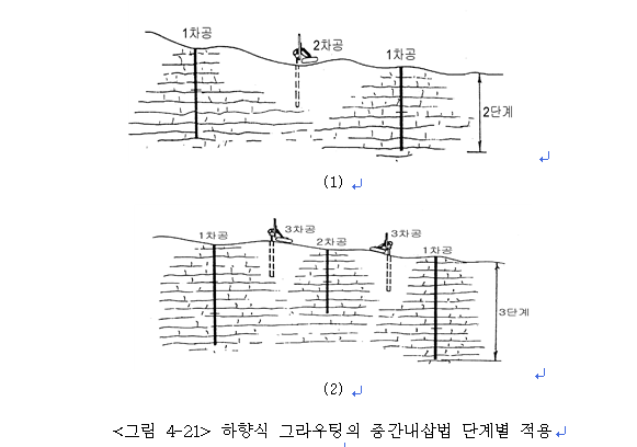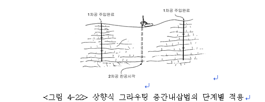 상향식 그라우팅에서는 2차공을 찬공하기 이전에 1차공의 찬공주입을 완료하며, 3차공을 찬공하기 이전에 2차공을 완료하여야 한다<그림 4-22>.