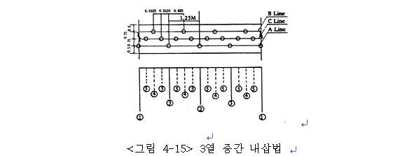 비록 3열의 주입을 하여 중간열에 완벽한 지수벽이 만들어졌다 하더라도 나머지 두 열의 지수커튼이 불완전하면 이를 통한 누수가 중간열을 약화시키고 결과적으로 전체지수벽을 통한 누수가 발생할 수 있다. 주입열의 시공은 2열의 경우 먼저 후열(하류측)을 시공하고 난 후 전열(상류측)을 시공토록하므로써 후열시공의 효과를 전열에서 확인해 볼 수 있다. 3열의 경우에는 전후열의 시공을 모두 끝낸 후 중간열을 시공하거나 <그림 4-15>처럼 3열 전체공을 내삽법으로 시공하기도하나 전자의 방법이 열별 주입효과와 주입량 검토분석이 용이하므로 효과적인 방법이다.