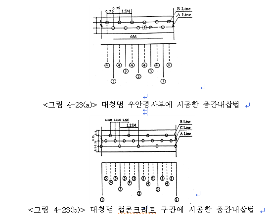 국내 대형댐에서 시공한 자료에 의하면 2~3열의 주입공을 4~5차에 걸친 내삽법으로 시공한 사례도 있는 바 현장의 작업조건, 주입열 수, 댐터의 길이, 댐터의 터파기 계획 등을 검토하여 시공순서를 결정하여야 한다<그림 4-23(a),(b)>.