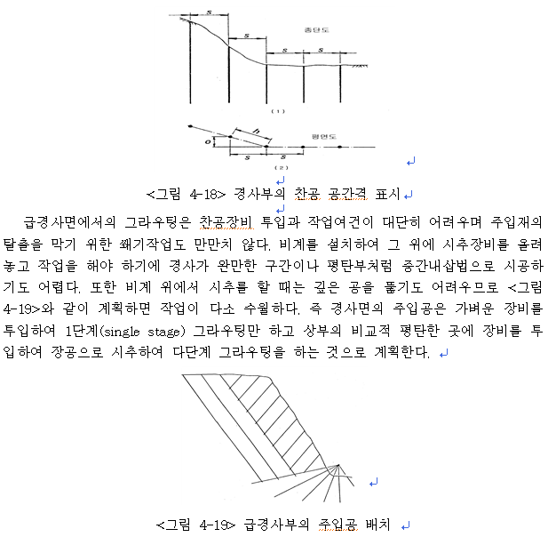 경사부 터파기면에 공배치를 할 때는 주의해야 한다. <그림 4-18(1)>처럼 종단도에 일정간격(S)으로 배치한 공간격은 수평거리와 경사거리의 차이로 인해 평면도에서는 S간격이 되지 않고 h간격이 된다. 그럼에도 설계서나 시방서에 공간격을 S로 한다거나 수평거리로된 평면도에 S간격으로 표시하는 경우가 있다. 다소간의 오차가 있어도 별 문제가 없는 댐터에서는 몰라도 고품질의 그라우팅을 해야 할 때는 1차공간의 간격, 시공효과의 판단 등에 문제가 된다. 또한 <그림 4-18(2)>와 같은 경사찬공때 경사거리로 잡은 공간격 S는 평면도에는 이보다 짧게 잡히게 된다. 따라서 수직찬공으로 할 것인가 경사찬공으로 할 것이냐 하는 문제는 지질구조대의 발달상태, 사용장비, 시공여건 등에 의해 결정할 것이나 공의 위치를 잡을 때의 혼란을 방지하기 위하여 경사부의 경사거리를 평면도에 옮겨서 공간격을 표시한다.