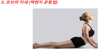 앞서 배를 땅에 닿게 두시고요.다리를 뒤로 쭉 뻗으시면서 머리, 턱, 배의 순서에 따라서 조금씩 상반신을 들어올립니다. 그리고 상반신을 다시 내릴 때는 처음과 같은 자세를 유지하되 정 반대 순서로 지면에 내려보내시면 된다고 합니다.