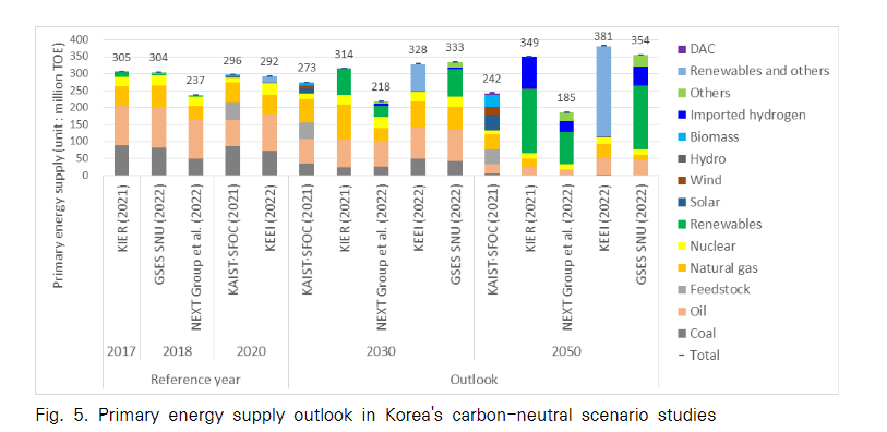 분석 대상 문헌 중에서 5편(KAIST·SFOC, 2021; KIER, 2021; NEXT Group et al., 2022; KEEI, 2022; GSES SNU, 2022)이 2050년 1차에너지 공급 전망을 제공하고 있다(Fig. 5, Table 5). 2050년 1차에너지 공급량을 비교한 결과, 기준 연도와 비교하여 최소 22% 감소(NEXT Group et al., 2022)에서 최대 30% 증가(KEEI, 2022)하고 평균 4% 증가하는 것으로 분석되었다.